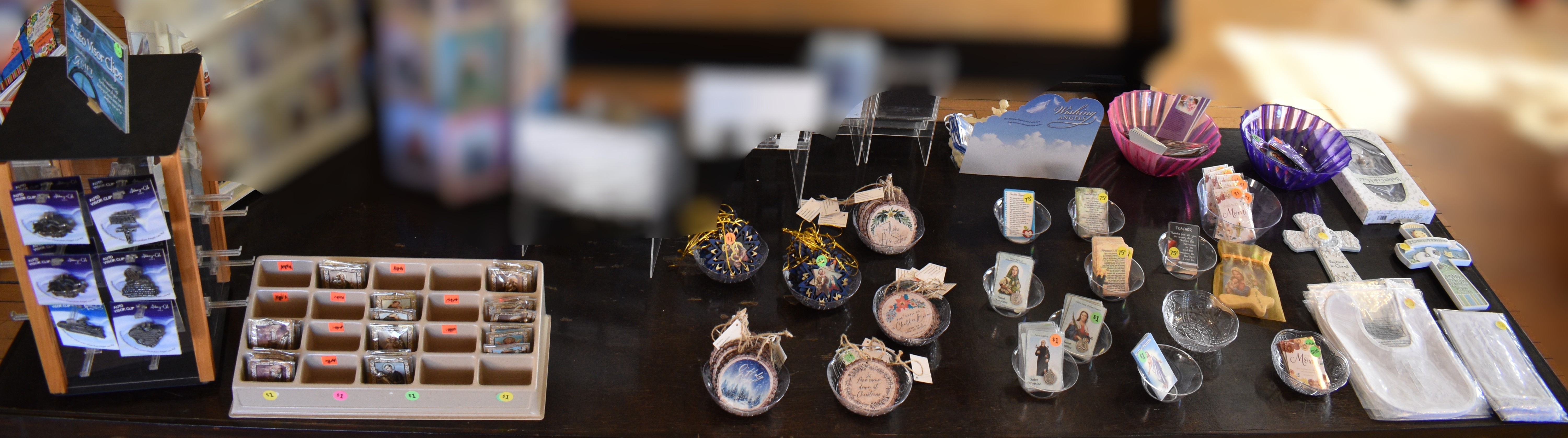 Here we have Bracelets ($12) and Car Rosaries ($10).